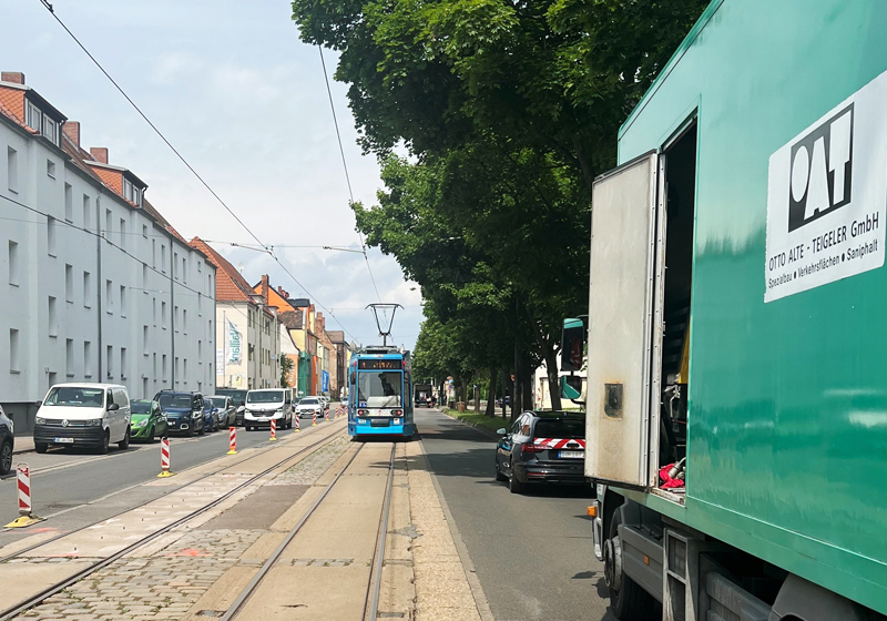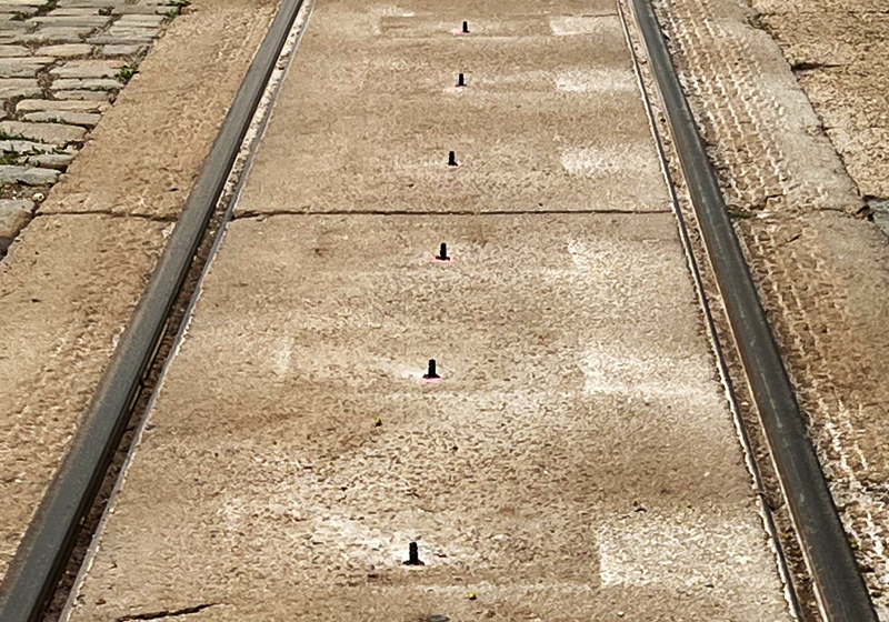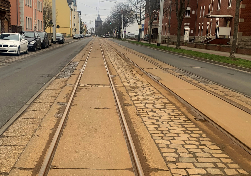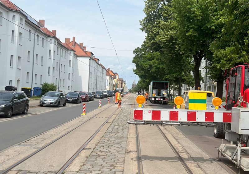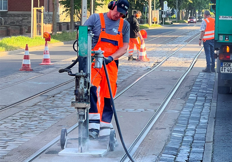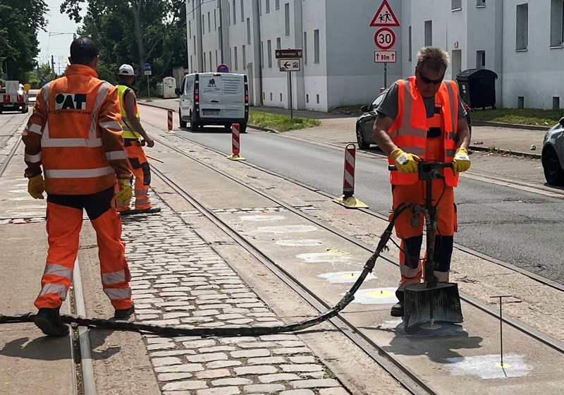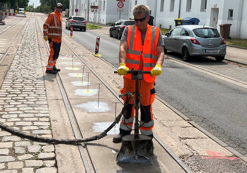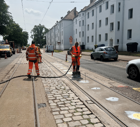 Nach einem erfolgreichen Vorversuch im Jahr 2023 wurden im betroffenen Abschnitt der Weißenfelser Straße unter laufendem Straßenbahnbetrieb die Hohlräume mittels Injektion von Silikatharz verfüllt und die Betonplatten stabilisiert. Dadurch konnte die Tragfähigkeit nachhaltig verbessert, die Nutzungsdauer der Bestandskonstruktion um viele Jahre verlängert und ein aufwendiger Austausch vorerst vermieden werden.
